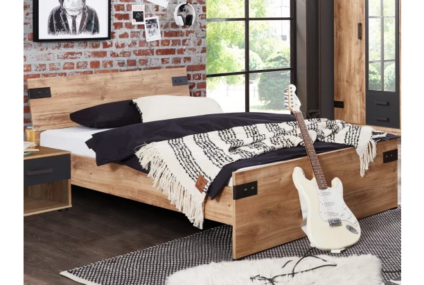 Posteľ o rozmere lôžka 140×200 cm z kolekcie Liverpool – moderný nábytok v duchu mestského industriálneho štýlu si obľúbia nielen mladí ľudia. Útulný dubový drevodekor dopĺňajú čierne kovové aplikácie.