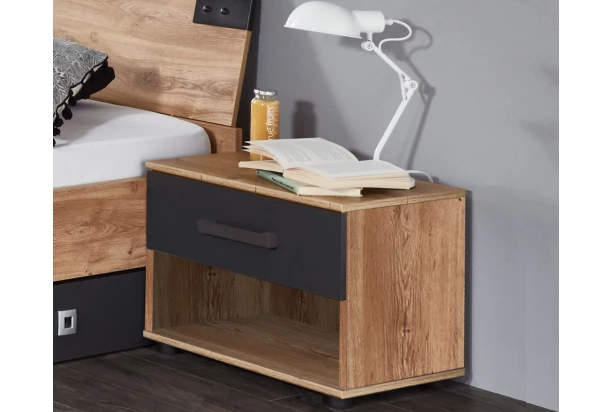 Nočný stolík z kolekcie Liverpool – moderný nábytok v duchu mestského industriálneho štýlu si obľúbia nielen mladí ľudia. Útulný dubový drevodekor dopĺňajú plochy tmavého grafitu a čierne úchytky.