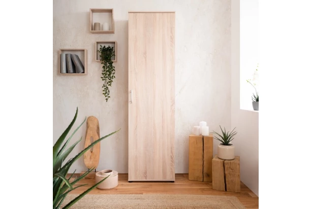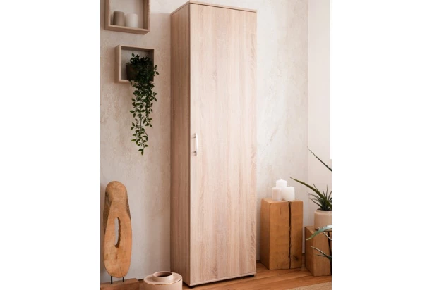Skriňa s celkovou šírkou 50 cm v dekore dub sonoma nájde univerzálne využitie v každej Vašej domácnosti. Za otočnými dverami nájdete úložný priestor s 5 policami, ktoré môžete výškovo nastavovať. Skriňa sa tak ľahko prispôsobí Vašim potrebám a rozmerovo sa hodí aj do malého priestoru.