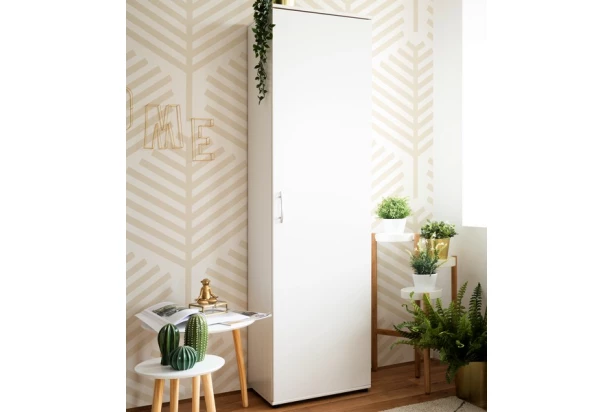 Skriňa s celkovou šírkou 50 cm v bielej farbe nájde univerzálne využitie v každej Vašej domácnosti. Za otočnými dverami nájdete úložný priestor s 5 policami, ktoré môžete výškovo nastavovať. Skriňa sa tak ľahko prispôsobí Vašim potrebám a rozmerovo sa hodí aj do malého priestoru.