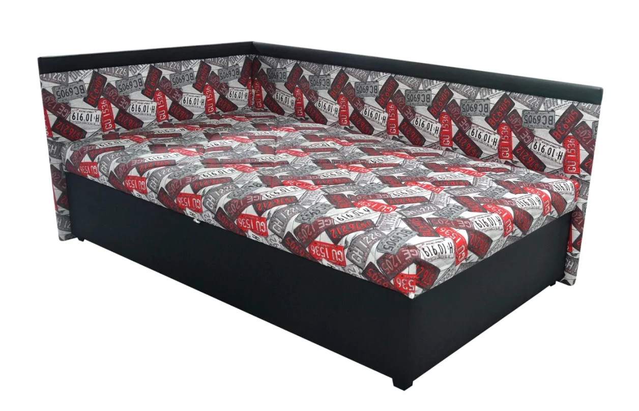 Rohová posteľ s praktickou bočnou stenou je vybavená matracom, lamelovým roštom aj úložným priestorom. Ľavá varianta, očalúnenie kombináciou šedej látky a tkaniny so vzorom.