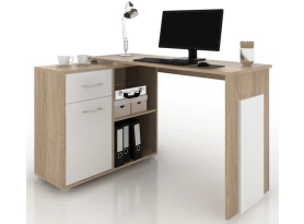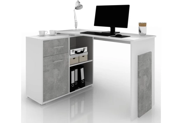Rohový písací stôl môžete ľubovoľne zostaviť s regálom umiestneným vpravo alebo vľavo. Stôl tak môžete ľahko umiestniť do akéhokoľvek kúta miestnosti. Vyrobený v kombinácii biely mat/sivá imitácia betónu.