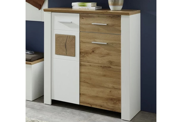 Úložná komoda/botník z programu Materia – moderný nábytok v kombinácii matne bielych povrchov s dubovým drevodekórom pre príjemný a útulne zariadený domov. Štýlová aplikácie s optikou rozpraskaného dreva, vytvára skvelý kontrast a zaujme na pohľad.