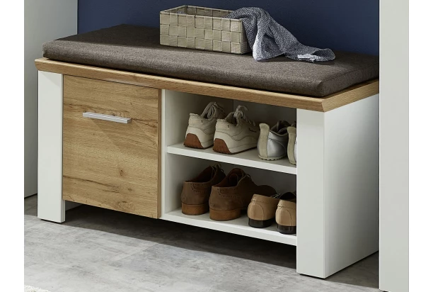 Predsieňový nízky botník/lavica s podsedákom z programu Materia – moderný nábytok v kombinácii matne bielych povrchov s dubovým drevodekórom pre príjemný a útulne zariadený domov.
