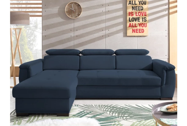 Trendová sedacia súprava si Vás získa príjemne mäkkým komfortom. Rohová sedačka ponúka polohovateľné chrbtové opierky na každodennú pohodu a bočný otoman pre chvíle relaxácie. U sedačky využijete aj rozkladaciu funkciu rozkladu a úložný priestor pod otomanom. Očalúnená odolnou látkou vo farbe námornícka modrá. Sedačka tvorí ľavý roh.