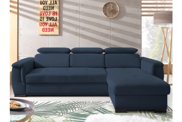 Trendová sedacia súprava si Vás získa príjemne mäkkým komfortom. Rohová sedačka ponúka polohovateľné chrbtové opierky na každodennú pohodu a bočný otoman pre chvíle relaxácie. U sedačky využijete aj funkciu rozkladu a úložný priestor pod otomanom. Očalúnená odolnou látkou vo farbe námornícka modrá. Sedačka tvorí pravý roh.