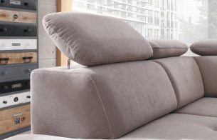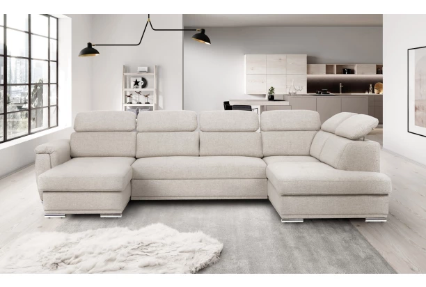 Trendová sedacia súprava v tvare pravej U si Vás získa priestrannosťou, príjemne mäkkým komfortom aj kvalitným spracovaním. Táto pohodlne polstrovaná sedačka ponúka polohovateľné chrbtové opierky na každodennú pohodu a bočné otomany pre chvíle relaxácie. Pri sedačke využijete dva úložné priestory a funkciu rozkladu na lôžko, ktoré môže byť využité aj na trvalé spanie. Sedačka je očalúnená jemne štruktúrovanou látkou vo farbe krémová. Poťahová látka je príjemne mäkká a zároveň odolná.