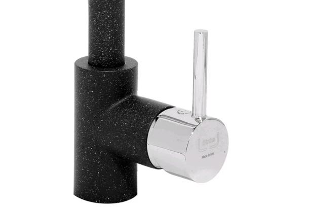 Stojánová páková drezová batéria Sinks Mix 35 s páčkou na bočnej strane a vysokým zaobleným ramenom. Vyrobená v prevedení čierny granit/chróm. Ideálna kombinácia spolu s granitovým drezom.