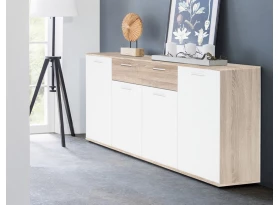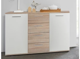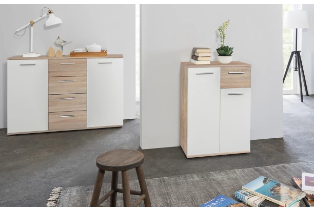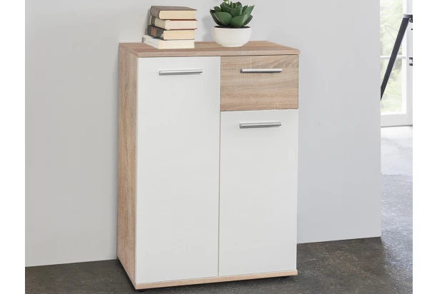 Skrinka so zásuvkou z radu Jacky – univerzálna komoda, ktorá poslúži prakticky či už v obývačke, spálni alebo v akejkoľvek šatni. Vyrobená v kombinácii dub sonoma/biela.