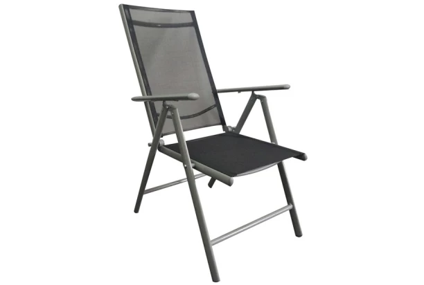 Moderné záhradné kreslo s kovovou konštrukciou, opierkami a funkciou polohovateľného operadla. Sedacia časť z čiernej umelej tkaniny.
