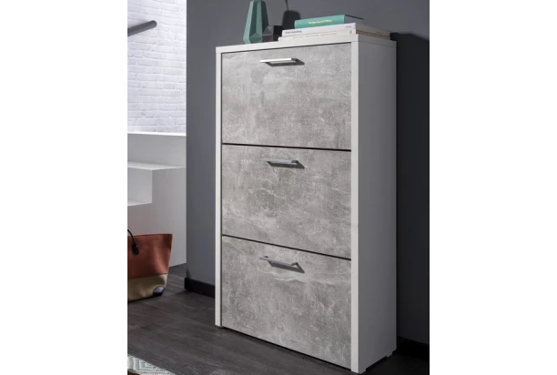 Moderný botník s výškou 115 cm ponúka 3 výklopné dvere s priehradkami na topánky. Široký rám botníku v bielej farbe dopĺňa imitácia sivého betónu na predných plochách.