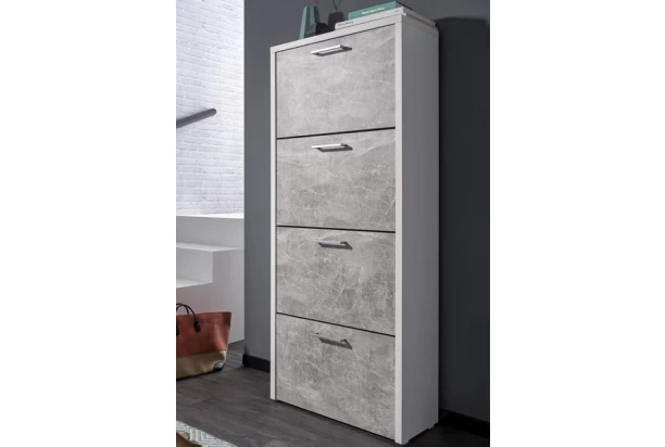 Moderný botník s výškou 152 cm ponúka 4 výklopné dvere s priehradkami na topánky. Široký rám botníku v bielej farbe dopĺňa imitácia sivého betónu na predných plochách.