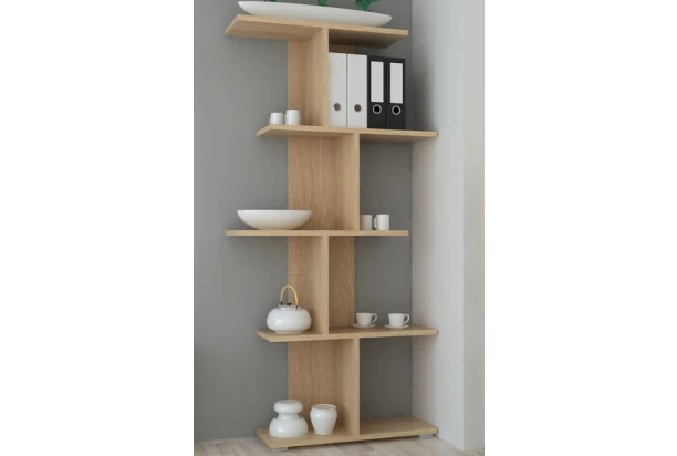 Vysoký regál má zaujímavú členitoú konštrukciu v dekore dub sonoma a poslúži ideálne pre dekorácie i knižky. Použitím viac regálov vedľa seba môžete vytvárať zaujímavé kompozície.