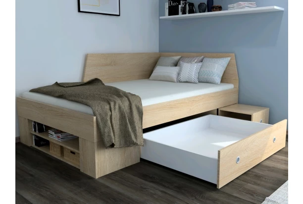 Posteľ v dekore dub sonoma o rozmere lôžka 120×200 cm je vybavená praktickou bočnou zástenou, odkladacími priehradkami a výsuvným nočným stolíkom. V dolnej časti je navyše ukrytá úložná zásuvka, do ktorej ľahko upracete posteľnú bielizeň, časť oblečenia, sezónne veci alebo napríklad aj detské hračky. Skvele tak poslúži v izbe každej vekovej kategórie (pre deti, teenagerov a dospelých).