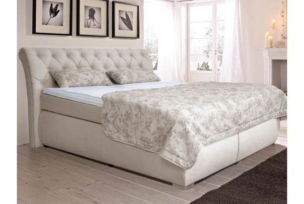 Komfortné vysoká posteľ typu boxspring s veľkosťou lôžka 180×200 cm v noblesnom glamour štýle. Elegantne zaoblené čelo s okrasnými gombíkmi a krémová poťahová látka s nariasením, pôsobí luxusne na pohľad. Dve vrstvy kvalitných matracov zaistia optimálnu oporu, príjemné uvoľnenie a komfortne mäkké spanie.