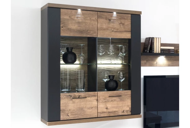 Ak chcete kvalitný a zároveň moderný dizajnový nábytok, potom je široká nástenná vitrína Boston práve pre vás. Horný rám obsahuje bodové LED svetlá, ktoré na štruktúrovanom povrchu nábytku hrajú hru svetla a tieňov a vytvárajú tak naozaj exkluzívny efekt. Nábytok zároveň zostáva účelný a praktický. Vitrína s osvetlením je vyrobená v kombinácii matne čiernej farby a útulného drevodekoru dub ribbeck.