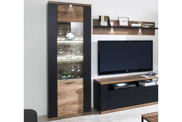 Ak chcete kvalitný a zároveň moderný dizajnový nábytok, potom je vysoká vitrína Boston práve pre vás. Horný rám obsahuje bodové LED svetlo, ktoré na štruktúrovanom povrchu nábytku hrá hru svetla a tieňov a vytvára tak skutočne exkluzívny efekt. Nábytok zároveň zostáva účelný a praktický. Vitrína s osvetlením je vyrobená v kombinácii matne čiernej farby a útulného drevodekoru dub ribbeck v prevedení ľavá – dvere otočné doľava.