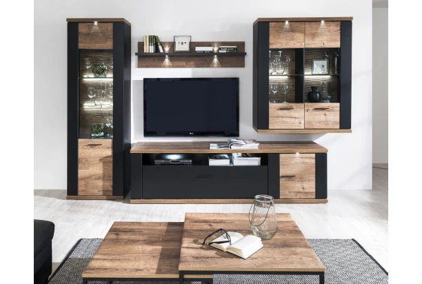 Polica s osvetlením a nástenným panelom so šírkou 132,5 cm z modernej dizajnovej kolekcie Boston je vyrobený v kombinácii matne čiernej farby a útulného drevodekoru dub ribbeck.