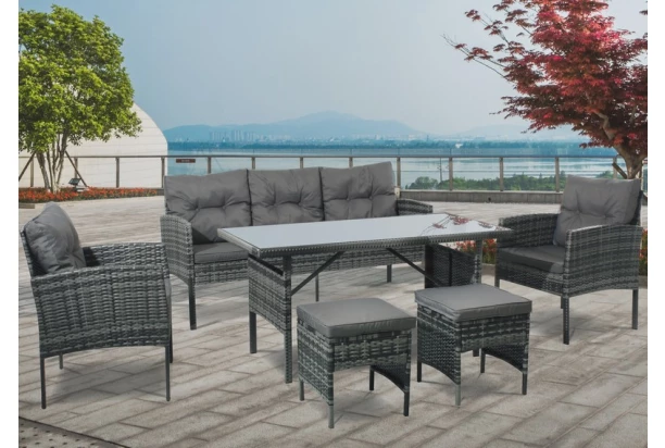 Komfortný set záhradného nábytku z imitácie ratanu obsahuje jedálenský stôl, lavicu dve kreslá a dva taburety. Vrátane sedacích a oporných vankúšov pre príjemné pohodlie s rodinou alebo priateľmi.