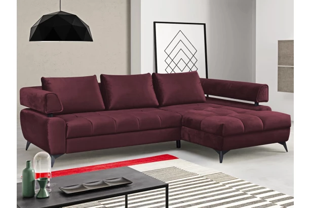 Atraktívna rohová sedacia súprava Paris je nielen pohodlná, ale aj zaujímavá na pohľad. Vzdušný dizajn tvarov dotvára veľké vankúše, moderné kovové nohy, dekoratívny prešiv a priestranný otoman. Sedačka tvorí pravý roh a je očalúnená kvalitnou látkou v lesklej zamatovej optike v odtieni vínová. Poteší aj z praktickej strany, vďaka úložnému priestoru a rozkladacej funkcii na príležitostné lôžko.