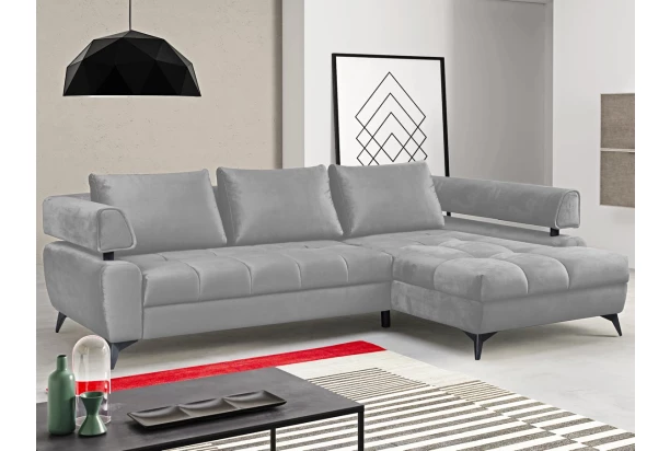Atraktívna rohová sedacia súprava Paris je nielen pohodlná, ale aj zaujímavá na pohľad. Vzdušný dizajn tvarov dotvára veľké vankúše, moderné kovové nohy, dekoratívny prešiv a priestranný otoman. Sedačka tvorí pravý roh a je očalúnená kvalitnou látkou v lesklej zamatovej optike v odtieni svetlo šedá. Poteší aj z praktickej strany, vďaka úložnému priestoru a rozkladacej funkcii na príležitostné lôžko..