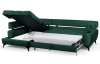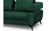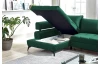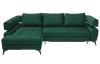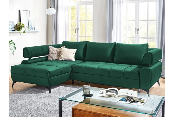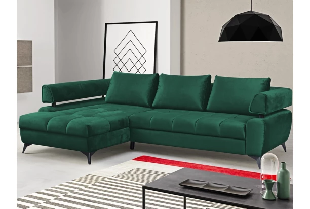 Atraktívna rohová sedacia súprava Paris je nielen pohodlná, ale aj zaujímavá na pohľad. Vzdušný dizajn tvarov dotvára veľké vankúše, moderné kovové nohy, dekoratívny prešiv a priestranný otoman. Sedačka tvorí ľavý roh a je očalúnená kvalitnou látkou v optike zamatu v tmavo zelenom odtieni. Poteší aj z praktickej strany, vďaka úložnému priestoru a rozkladacej funkcii na príležitostné lôžko.