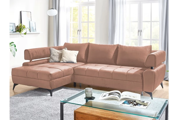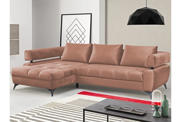 Atraktívna rohová sedacia súprava Paris je nielen pohodlná, ale aj zaujímavá na pohľad. Vzdušný dizajn tvarov dotvárajú veľké vankúše, moderné kovové nohy, dekoratívny prešiv a priestranný otoman. Sedačka tvorí ľavý roh a je očalúnená kvalitnou látkou v optike zamatu v odtieni lososová. Poteší aj z praktickej strany, vďaka úložnému priestoru a rozkladacej funkcii na príležitostné lôžko.