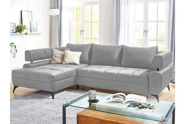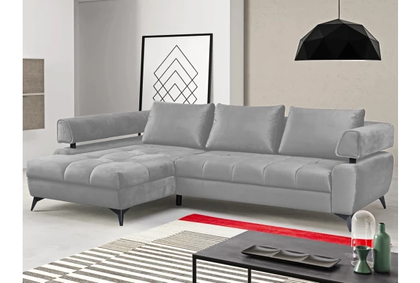 Atraktívna rohová sedacia súprava Paris je nielen pohodlná, ale aj zaujímavá na pohľad. Vzdušný dizajn tvarov dotvárajú veľké vankúše, moderné kovové nohy, dekoratívny prešiv a priestranný otoman. Sedačka tvorí ľavý roh a je očalúnená kvalitnou látkou v optike zamatu v odtieni svetlo šedá. Poteší aj z praktickej strany, vďaka úložnému priestoru a rozkladacej funkcii na príležitostné lôžko.