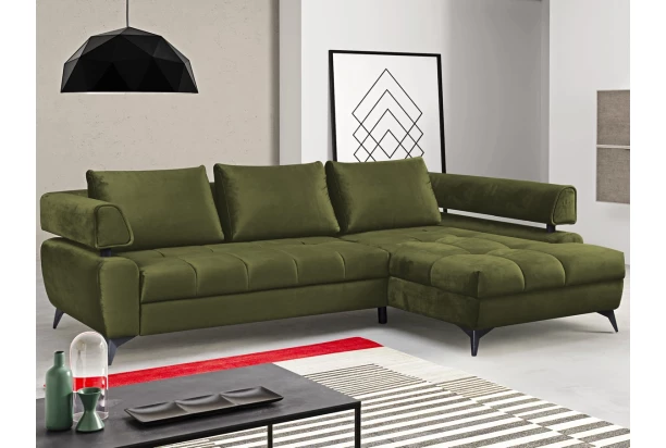 Atraktívna rohová sedacia súprava Paris je nielen pohodlná, ale aj zaujímavá na pohľad. Vzdušný dizajn tvarov dotvárajú veľké vankúše a moderné kovové nohy, dekoratívny prešiv a priestranný otoman. Sedačka tvorí pravý roh a je očalúnená kvalitnou látkou v lesklej zamatovej optike v odtieni machová zelená. Poteší aj z praktickej strany, vďaka úložnému priestoru a rozkladacej funkcii na príležitostné lôžko.