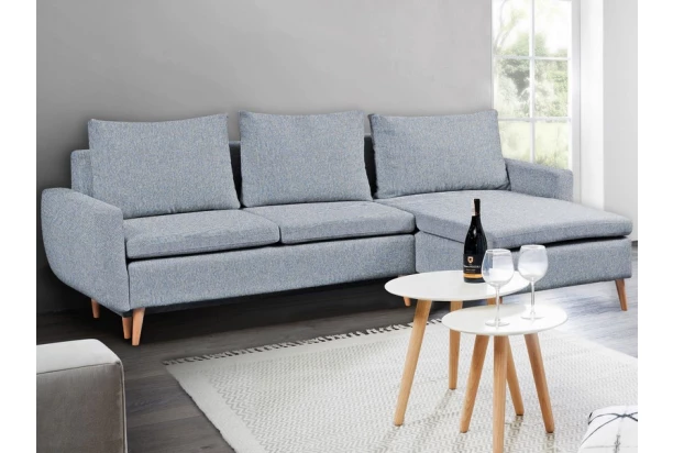 Rohová sedacia súprava v príjemnom škandinávskom štýle, pasuje rozmerovo takmer do každého bytu. Univerzálny otoman, možné umiestniť na pravú alebo ľavú stranu a sedačku si ľahko prispôsobiť podľa potreby. Očalúnená tkaninou v béžovo-modrom odtieni. Vrátane rozkladacej funkcie a vnútorného úložného miesta.