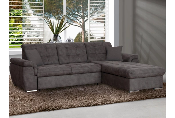 Elegantná rohová sedacia súprava s vysokou mierou pohodlia vďaka kvalitnému vypolstrovaniu a s polohovaním chrbtových opierok. Očalúnenie tmavo sivou látkou v optike brúsenej kože a doplnená prešitím. Variant sedačky s pravým otomanom, bez funkcie rozkladu a bez úložného priestoru.
