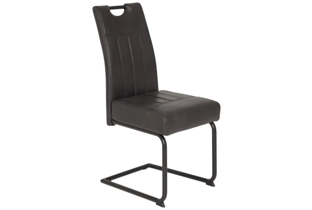 Komfortná jedálenská stolička s pružinovým jadrom je očalúnená antracitovou látkou s lesklým efektom vo vintage optike brúsenej kože. Čierna kovová podnož dodáva stoličke stabilný základ