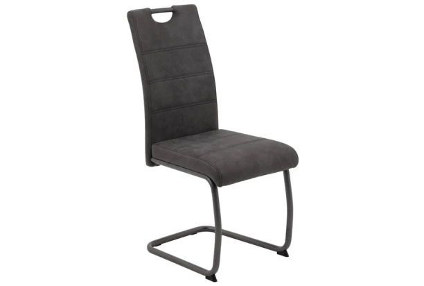 Moderná jedálenská stolička má zaoblený dizajn, šedú konštrukciu s praktickým madlom a komfortný sedák potiahnutý antracitovou látkou vo vintage optike.