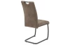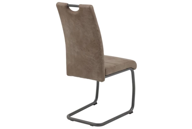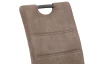 Moderná jedálenská stolička má zaoblený dizajn, šedú konštrukciu s praktickým madlom a komfortný sedák potiahnutý béžovou látkou vo vintage optike.
