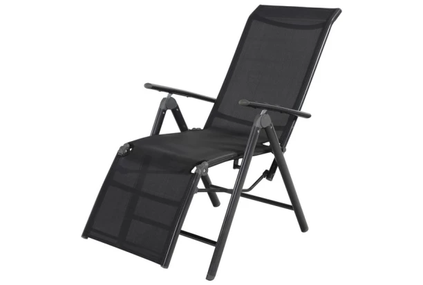 Univerzálne záhradné kreslo s opierkami pre chvíle pohody na slnku aj v tieni. Vďaka funkcii polohovania možno premeniť na pohodlné ležadlo na slnenie alebo relaxáciu. V kombinácii kovu a čiernej umelej tkaniny.