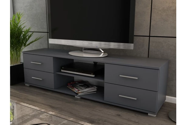 Na 180 cm široký TV stolík môžete umiestniť nielen televíziu, ale napríklad aj lampičku alebo dekoráciu – obsahuje 2 priestranné priehradky pre elektroniku i 4 zásuvky pre uschovanie drobností. V šedej grafitovej farbe