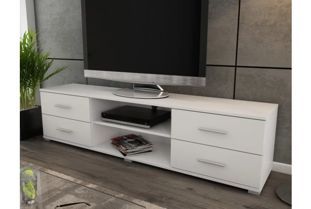Na 180 cm široký TV stolík môžete umiestniť nielen televíziu, ale napríklad aj lampičku alebo dekoráciu – obsahuje 2 priestranné priehradky pre elektroniku a 4 zásuvky pre uschovanie drobností. V bielom prevedení.