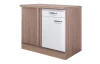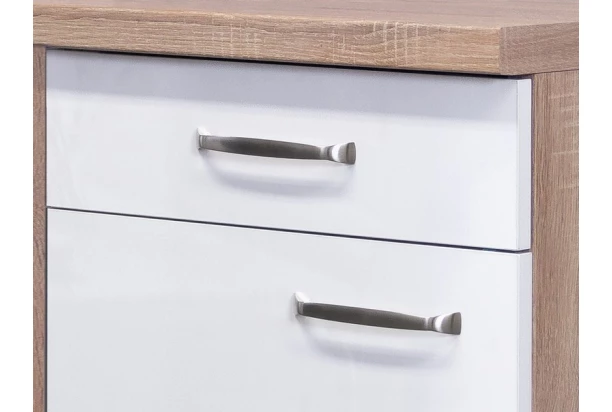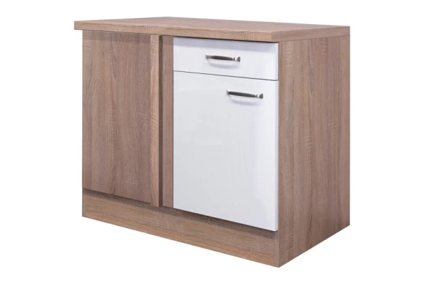 Dolná rohová kuchynská skrinka so šírkou 110 cm z elegantného kuchynského programu Valero – útulnú kombináciu dekoru dub sonoma a bielej farby vo vysokom lesku dopĺňa zaoblený kovový úchyt v nerezovom vyhotovení. Elementy kuchynského programu Valero môžete medzi sebou ľubovoľne kombinovať a zostaviť si tak kuchyňu podľa vašich individuálnych potrieb a priestorových možností.