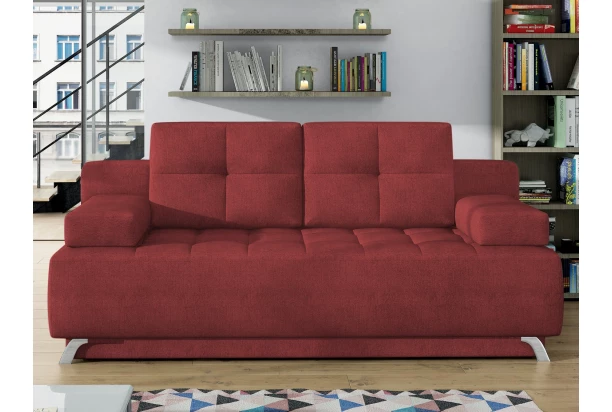 Moderná pohovka s atraktívnym prešivom komfortného sedadla a oporných vankúšov. Rozkladacia funkcia na príležitostné lôžko uspokojí vašu návštevu a do úložného priestoru môžete uschovať lôžkoviny alebo sezónne veci. Očalúnená mäkučkou látkou v červenom odtieni.