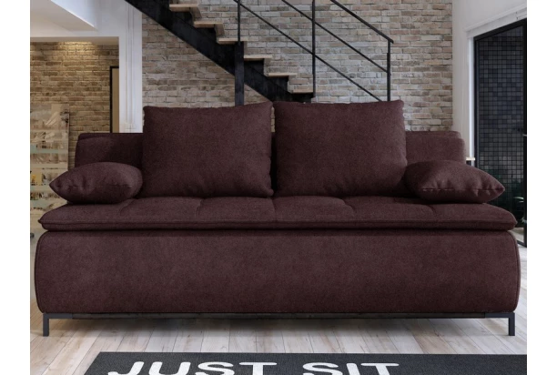 Komfortne vypolstrovaná pohovka s veľkými vankúšmi je vybavená s rozkladaciou funkciou na lôžko, ktoré môžete využiť aj pre bežné spanie. Očalúnená príjemne mäkkou látkou v tmavo fialovom odtieni, doplnená prešitím a kovovými nohami.