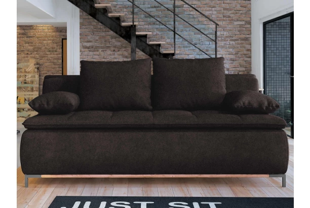 Komfortne vypolstrovaná pohovka s veľkými vankúšmi je vybavená rozkladacou funkciou na lôžko, ktoré môžete využiť aj pre bežné spanie. Očalúnená príjemne mäkkou látkou v hnedom espresso odtieni, doplnená prešitím a kovovými nohami.