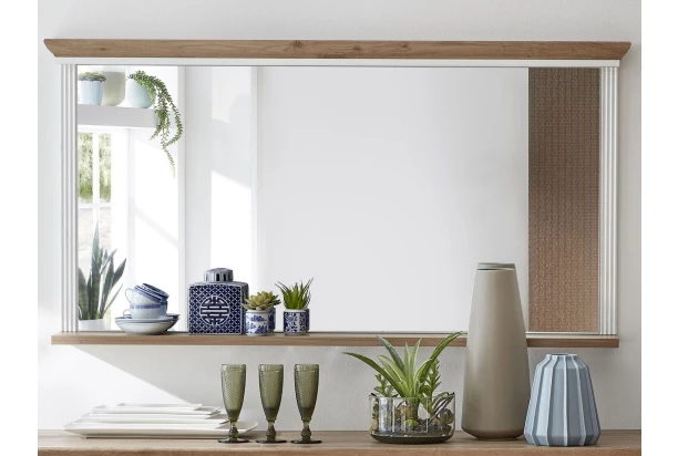 Nástenné zrkadlo s poličkou v prevedení bielená pínia s dubovým drevodekorom z kolekcie Jasmin – nábytok v modernom vidieckom štýle s dôrazom na detail nadväzuje na tradíciu útulne zariadeného domova a priamo láka k tomu, aby ste si vytvorili prostredie, kde sa budete cítiť dobre. Kombinujte tak jednotlivé elementy z tohto radu a vytvorte si štýlový rustikálny interiér s nádychom tradície.