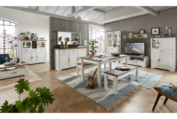 TV skrinka so šírkou 143 cm v prevedení bielená pínia s dubovým drevodekorom z kolekcie Jasmin – nábytok v modernom vidieckom štýle s dôrazom na detail nadväzuje na tradíciu útulne zariadeného domova a priamo láka k tomu, aby ste si vytvorili prostredie, kde sa budete cítiť dobre. Kombinujte tak jednotlivé elementy z tohto radu a vytvorte si štýlový rustikálny interiér s nádychom tradície.