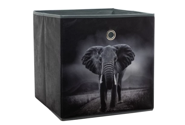Úložný látkový box s potlačeným motívom slona v divočine poslúži ako praktická súčasť regálu alebo vnútorného vybavenia skriniek, prípadne ho môžete umiestniť samostatne. Jeho konštrukciu možno kedykoľvek ľahko zložiť a uschovať.