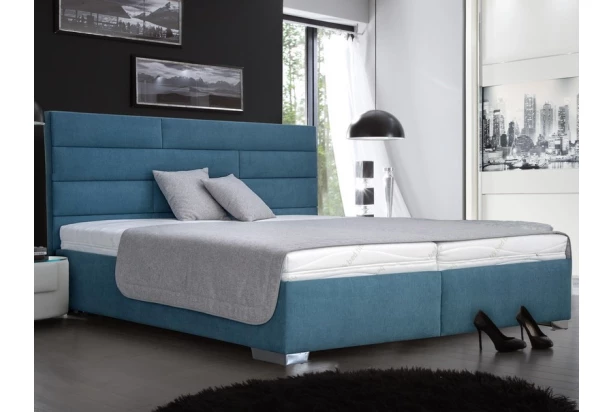 Trendová manželská posteľ o rozmere lôžka 180×200 cm, zaujme atraktívnym prešitím zadného čela. Navyše obsahuje polohovateľné rošty pre lepší komfort a úložné priestory pre praktické ukladanie vecí. Očalúnená látkou v tyrkysovo modrom odtieni.