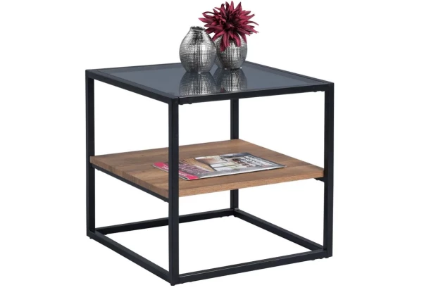 Malý štvorcový stolík o veľkosti 50×50 cm poslúži pri sedačke a kresle ako konferenčný stolík alebo ako prístavný stolík kdekoľvek v rohu miestnosti napríklad na umiestnenie lampičky. Vzdušne pôsobiaca konštrukcia z čierneho kovu a šedého skla je doplnená útulným dubovým drevodekorom na dolnej odkladacej poličke.