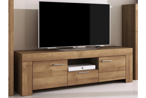TV skrinka s nástennou policou z programu Sky – nábytok s optikou širokých rámov je vyrobený v drevodekore dub riviera a vytvorí v každom interiéri útulnú domácku atmosféru.