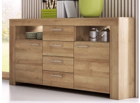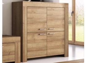 Vysoká vitrína z programu Sky – nábytok s optikou širokých rámov je vyrobený v drevodekore dub riviera a vytvorí v každom interiéri útulnú domácku atmosféru.