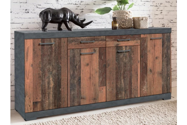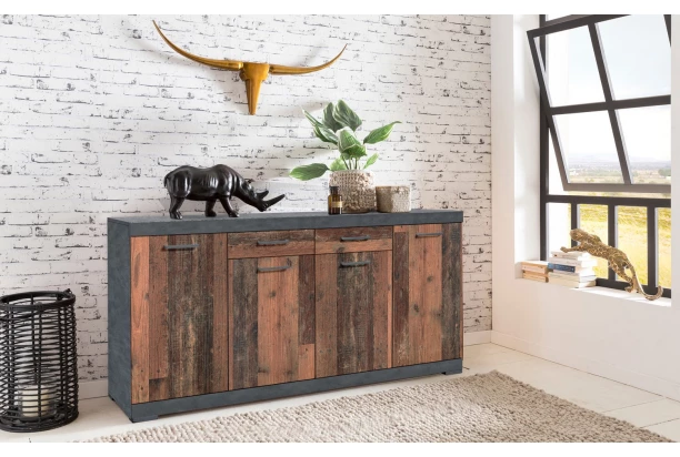 Široká komoda o šírke 160 cm z rady Bristol je praktická a zároveň zaujme na pohľad. V kombinácii imitácia brúseného kovu s vintage optikou drevených dosiek – skvelé doplnenie štýlovo zariadeného bytu.