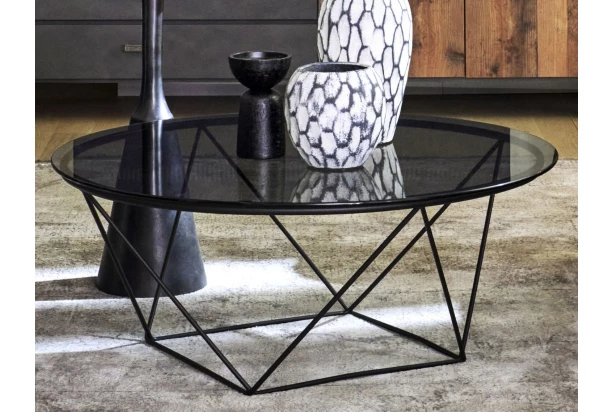 Okrúhly konferenčný stolík s priemerom 90 cm má nadčasový nekonvenčný dizajn. Filigránska podnož z čierneho kovu vytvára geometrické tvary s spolu s hornou plochou z dymovo šedého skla pôsobí stolík ľahko a zároveň veľmi elegantne. Tento stolík prakticky poslúži a dobre vynikne pri modernej sedačke či pohovke.